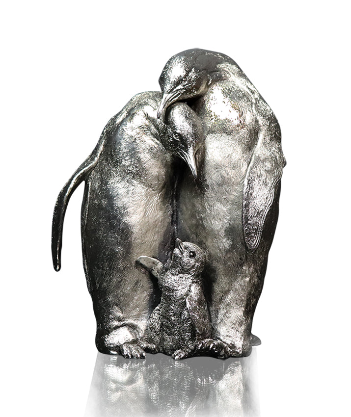 This design by Keith Sherwin, is one of 8 in the” Nature’s Bond” series, all of which depict the relationship between mother and/or father and their young. This heart-warming design sees a devoted penguin couple caring for their tiny young chick. The whole sculpture is generously coated in nickel and then given an antique finish to bring the detail to the fore. A catalogue giving details of other titles is enclosed in the presentation box.